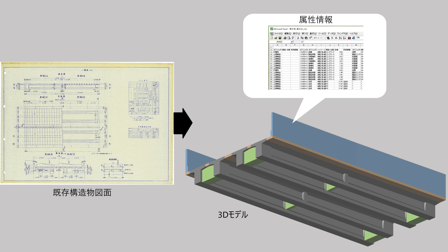 既存構造物のラスター図面等をもとに、3Dモデルを作成します。3Dモデルにすることで、点検や補修など維持管理の場面での活用が期待できます。さらに、属性情報を付与すると集計が可能となるため、施設管理の効率化もはかれます。